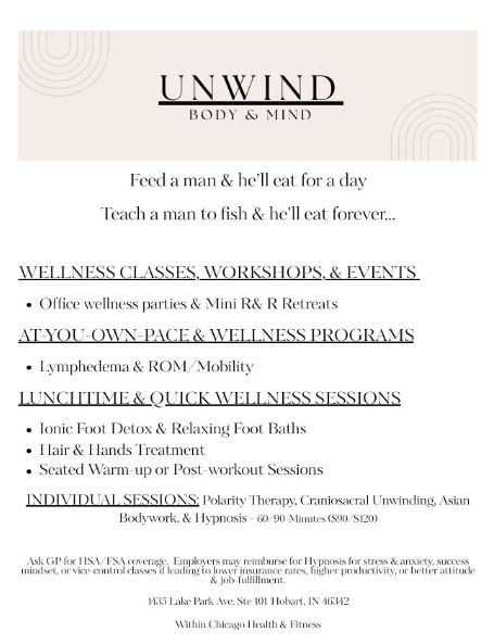 Office employees, or a group of friends get together for some treatments & classes.